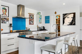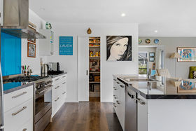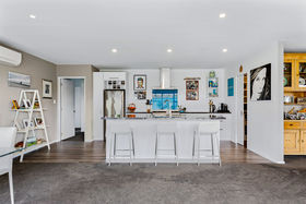 Inside, this well-configured home boasts four good-sized bedrooms and two bathrooms, including an ensuite off the master. The modern kitchen (complete with large central island) and the open-plan dining/living areas are complemented by a separate formal lounge, offering flexibility for families of all shapes and sizes. The home is sunny and warm, with an abundance of glass bathing the communal areas in natural light and a bevy of intelligent heating solutions, that include a heat pump and gas fire. Built to entertain, the large, open plan living area spills effortlessly outside.
